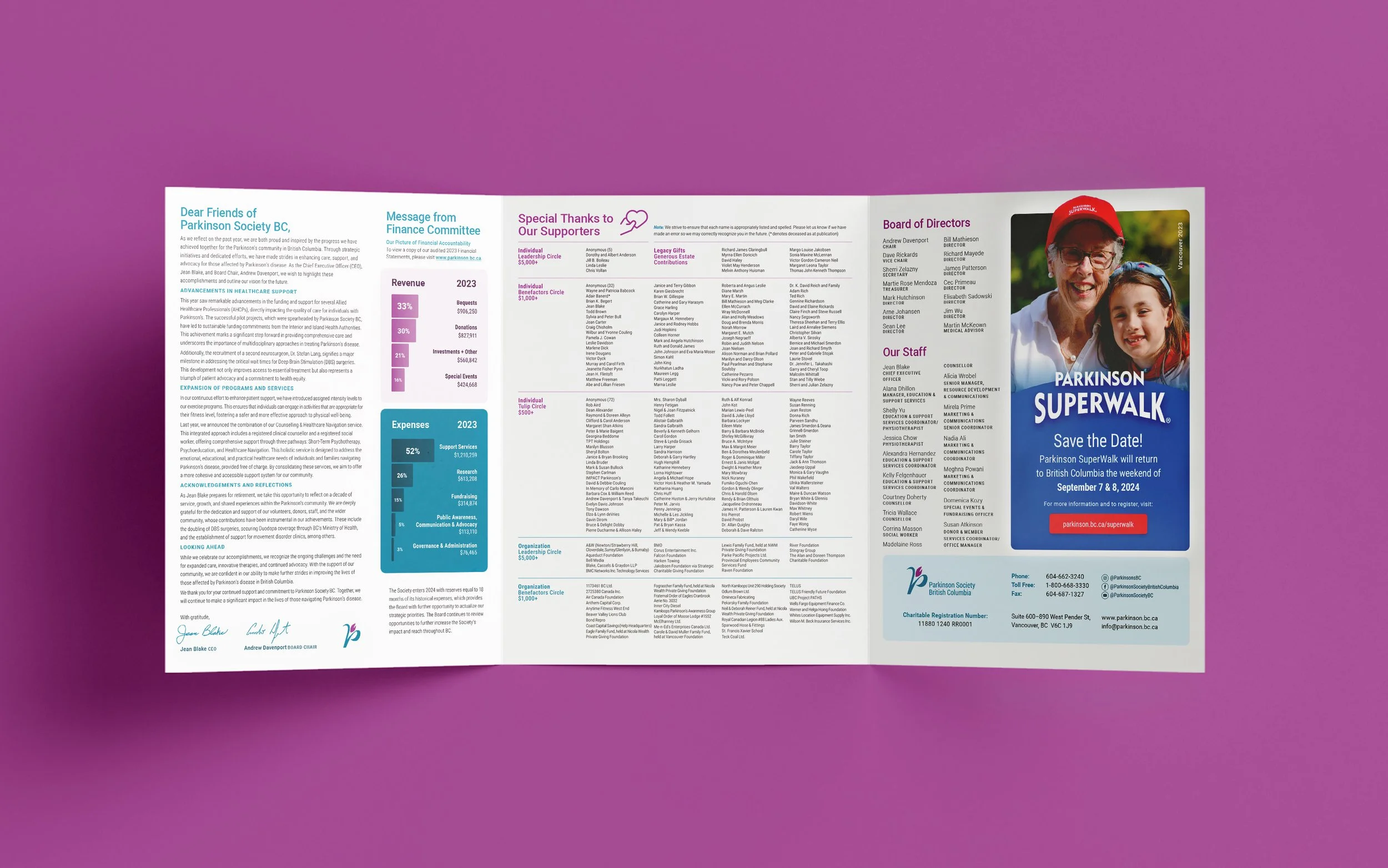 Through quarterly and annual publications, awareness campaigns and events like SuperWalk, I’ve had the opportunity to build on an existing brand as an external partner, including the introduction of illustrations, icons, and refreshed publication design. I am glad to continue working with PSBC and experiencing their mission to provide valuable resources for those affected by Parkinson's disease and to make a difference in the lives of individuals and families across British Columbia.